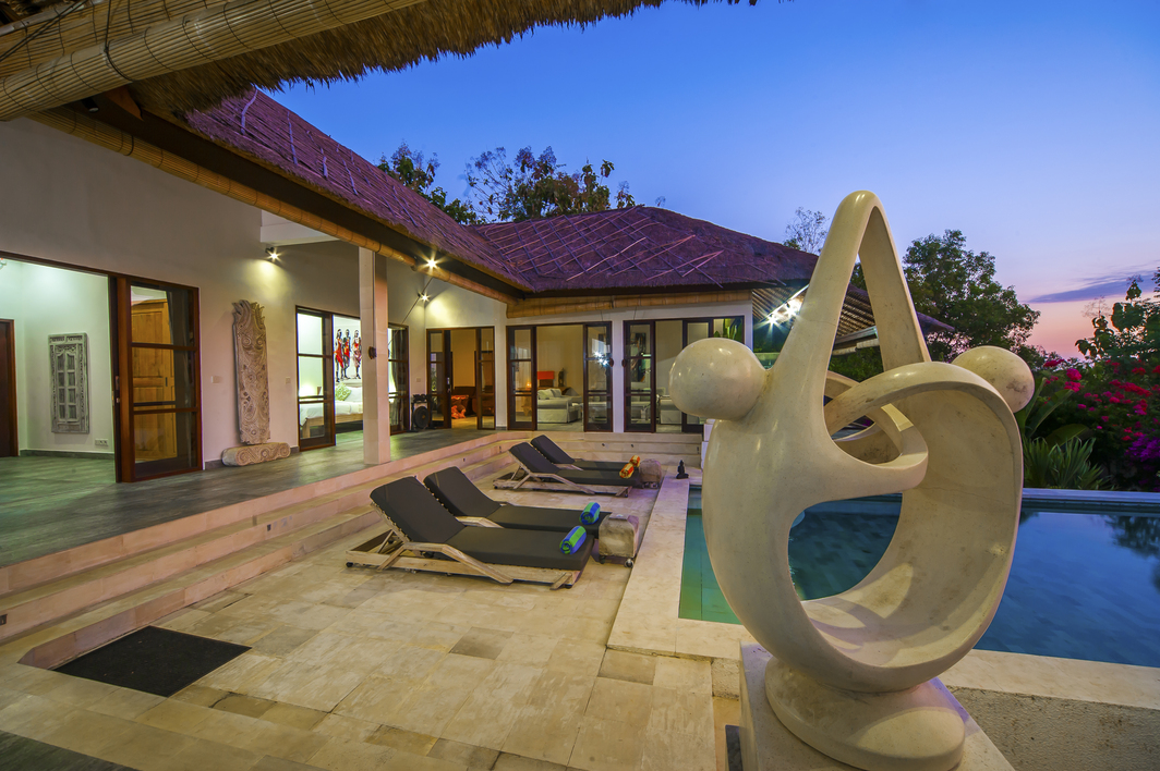 Michiko Villa is an exclusive private villa with spacious rooms in modern interior designs. The villa ambience really prioritizes the comfort side for anyone who stays in it. The exterior of the villa is characterized by its large glass windows, and a minimalist color palette that complements the lush tropical landscape. Designed for both relaxation and entertainment, featuring a private pool with panoramic views, sun loungers, and open dining spaces.